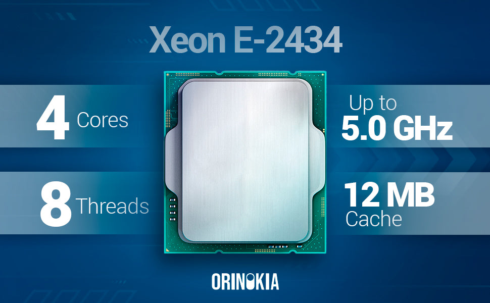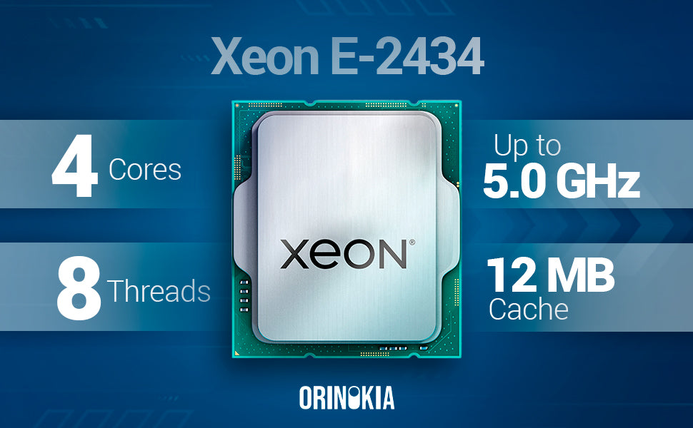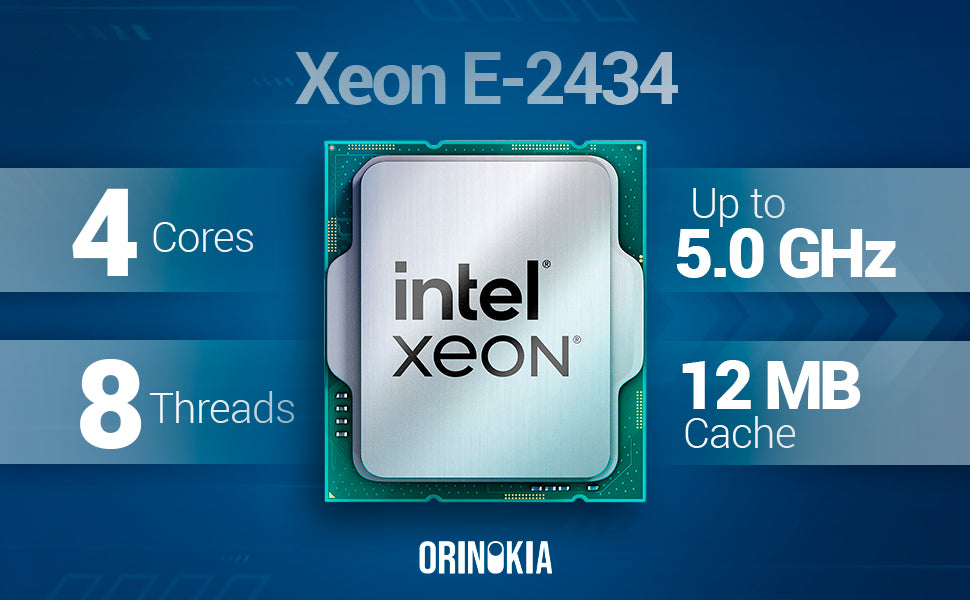 - Intel Xeon E-2434 (4 cores / 8 threads, up to 5.0GHz turbo, 8MB cache)